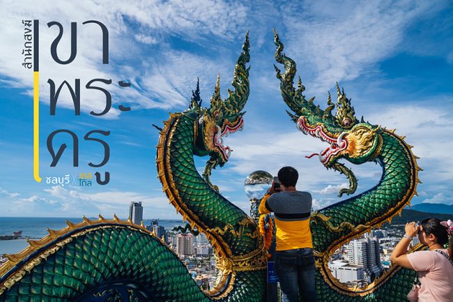 สำนักสงฆ์เขาพระครู (Khao Phra Khru) สถานปฏิบัติธรรมที่ตั้งอยู่บนเขาใจกลางเมืองศรีราชา (Si Racha) จ.ชลบุรี (Chon Buri) ที่นอกจากจะเป็นศาสนสถานไว้ให้เพื่อนๆ ได้ไหว้พระทำบุญกันแล้ว… ยังถือเป็นจุดชมวิวที่สวยสุดของเมืองศรีราชาอีกด้วย เมื่อเข้ามาในบริเวณสำนักสงฆ์ฯ เพื่อนๆ จะพบกับพระพุทธสีขาวมุข และประติมากรรมลายไทยที่ลงสีด้วยโทนน้ำเงิน-เขียว โดดเด่นเป็นเอกลักษณ์… โดยเฉพาะพระพุทธลีลานาคะบารมี และพระอุปคุตปางจกบาตร ที่หาชมได้ค่อนข้างยากสำหรับชาว#สายบุญ แต่สำหรับ#สายเที่ยวอย่างพวกเรา… คงต้องยกให้ มณีนาคราช (ลูกแก้วพญานาค) เป็นไฮไลท์เด็ด!! เพราะสามารถเห็นเมืองศรีราชากลับหัว (Upside Down) แบบพาโนรามิควิว 180° ผ่านเงาของลูกแก้วขนาดใหญ่ได้อย่างสวยงามแปลกตา โดยลูกแก้วพญานาคใบนี้ จะตั้งอยู่บริเวณลานชมวิวด้านบนคู่กับรูปปั่นพญานาค 2ตน ที่วิจิตรงดงามด้วยงานปั่นที่ลงรายละเอียดต่างๆ ได้อย่างครบถ้วน …หากย้อนไปในอดีต สำนักสงฆ์แห่งนี้เริ่มต้นมาจากแรงศรัทธาต่อการออกธุดงค์ของท่านพระครูธรรมธรเที่ยง จนก่อเกิดเป็นกุฏิหลังแรกบนเขาลูกนี้ในปีพ.ศ. 2479 โดยการถวายปัจจัยของเจ้าจอมหม่อมราชวงศ์สดับ ในรัชกาลที่ 5 ซึ่งชาวบ้านได้เรียกสำนักสงฆ์เขาพระครู ตั้งแต่นั้นเป็นต้นมา กาลเวลาหมุนเปลี่ยน… ภายหลังจากการมรณภาพของทั้ง 2พระครู (พระครูธรรมธรเที่ยง…